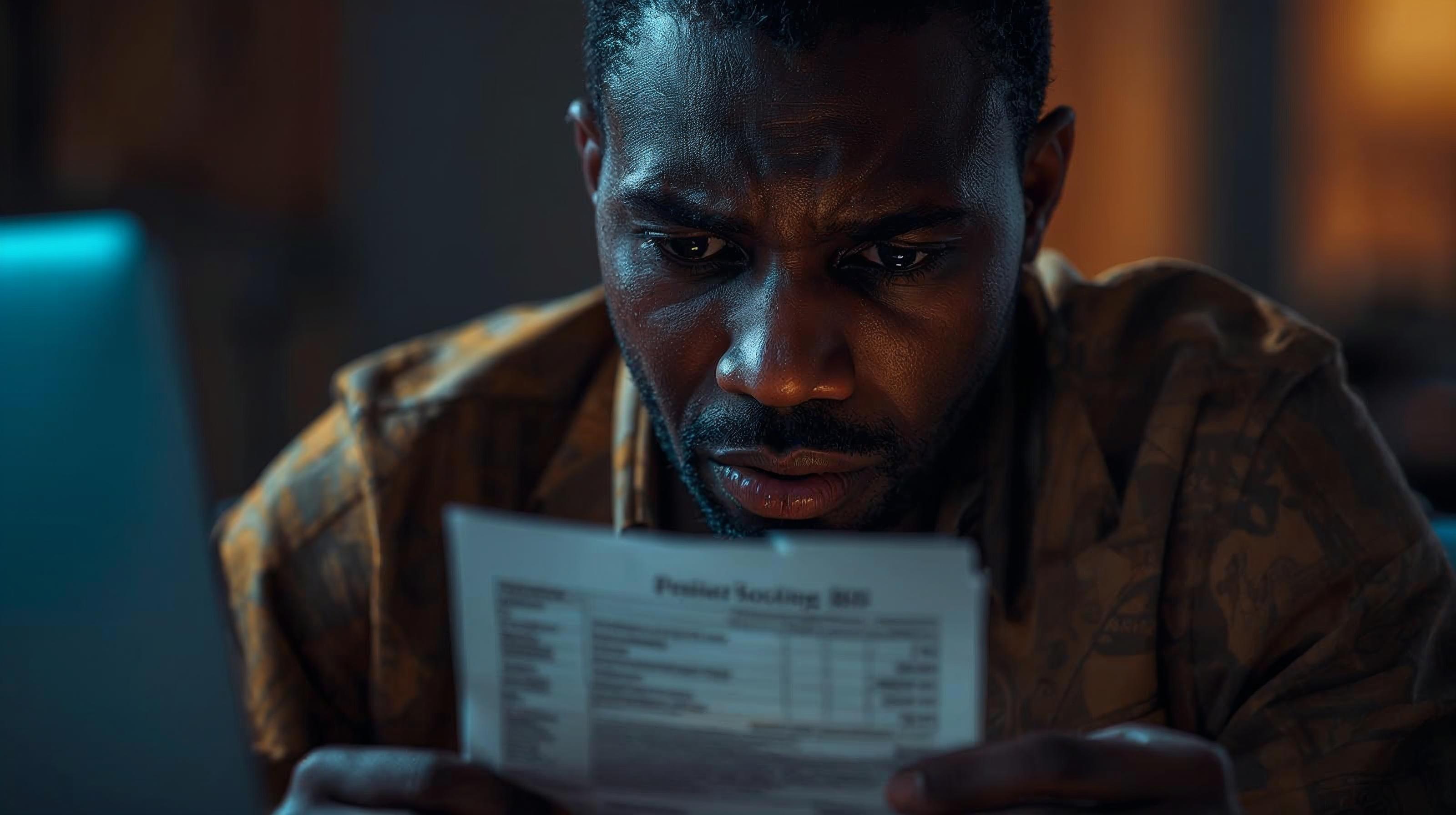 A business owner looking at his monthly hosting bill with a frustrated, discouraged, and sad expression.