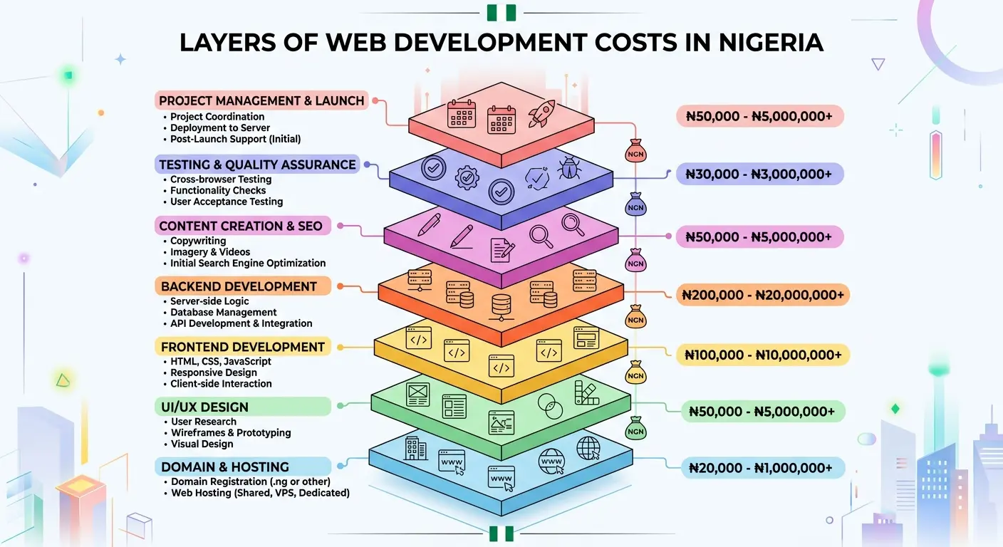 The cost of building a website in Nigeria typically ranges from N150,000 for basic business sites to over N5,000,000 for custom enterprise solutions. These costs are influenced by domain registration, hosting services, design complexity, and the functional requirements of the platform. By viewing your website as a digital asset rather than a one-time expense, you can ensure long-term scalability and business impact.