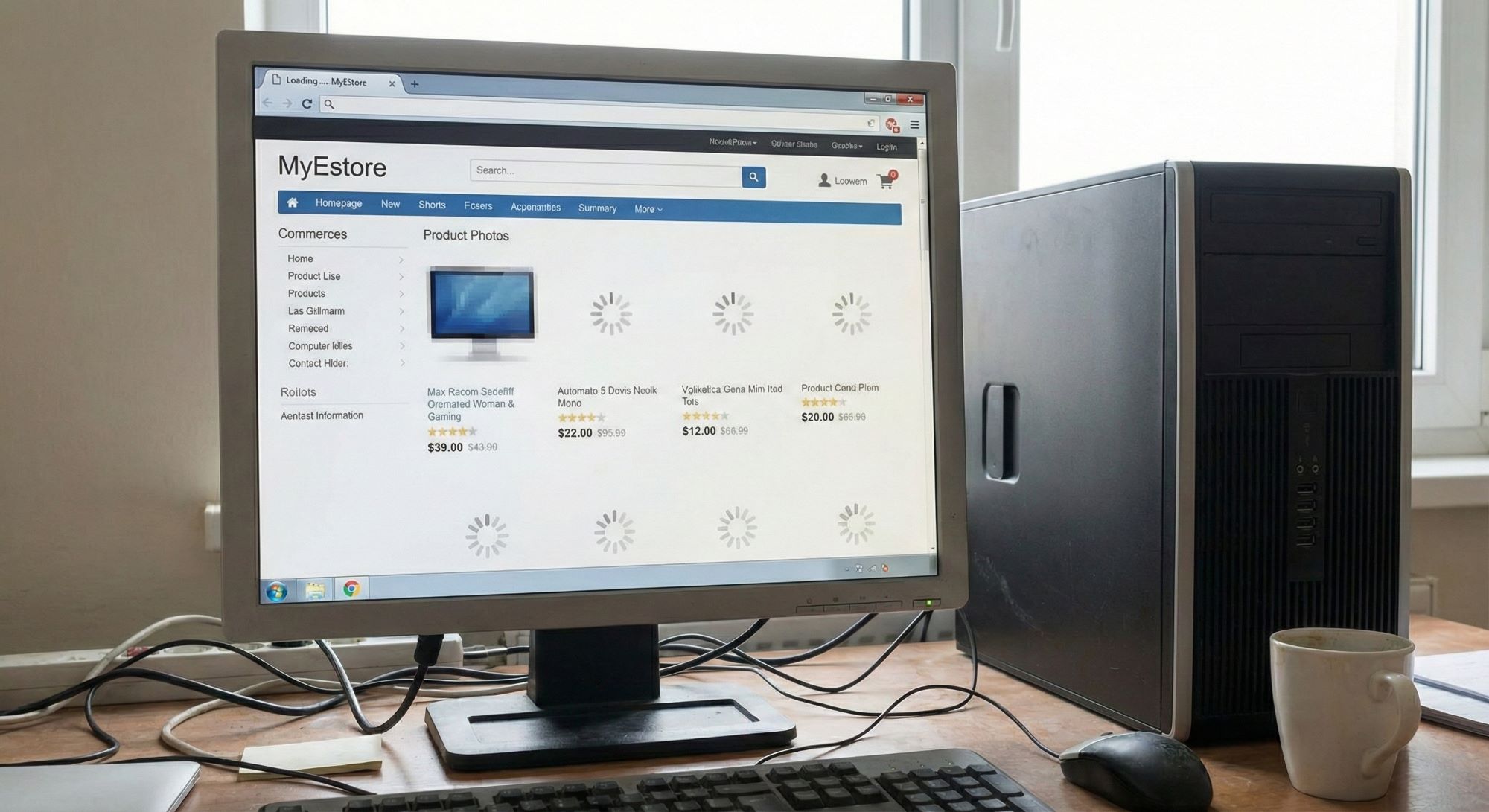 A split screen showing a poorly built eCommerce website versus a well-optimized one, where the slow site is losing sales while the optimized site is getting orders and happy customers
