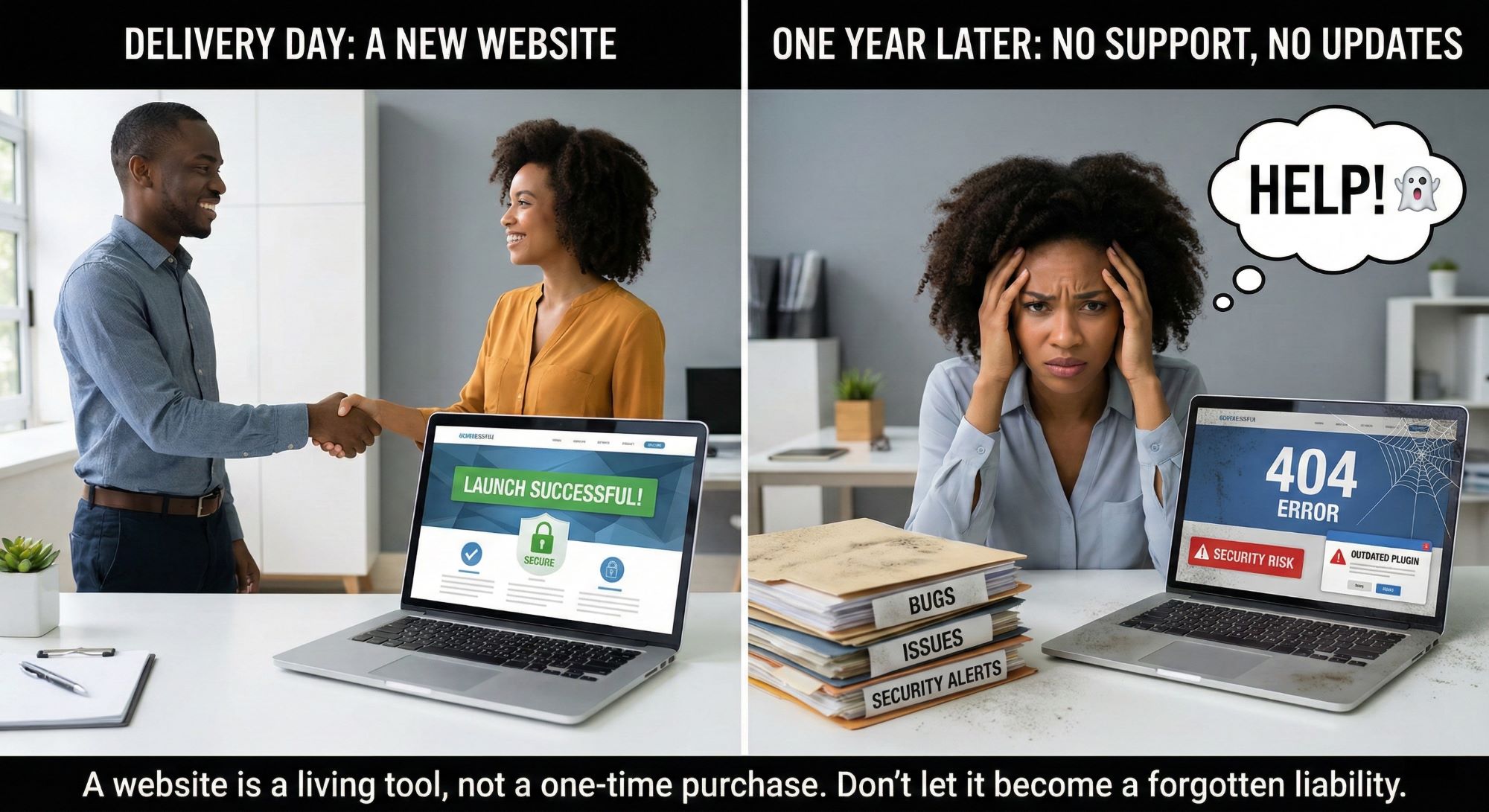 A split screen showing a website at delivery versus the same website one year later, without maintenance or post-launch support, filled with bugs and errors