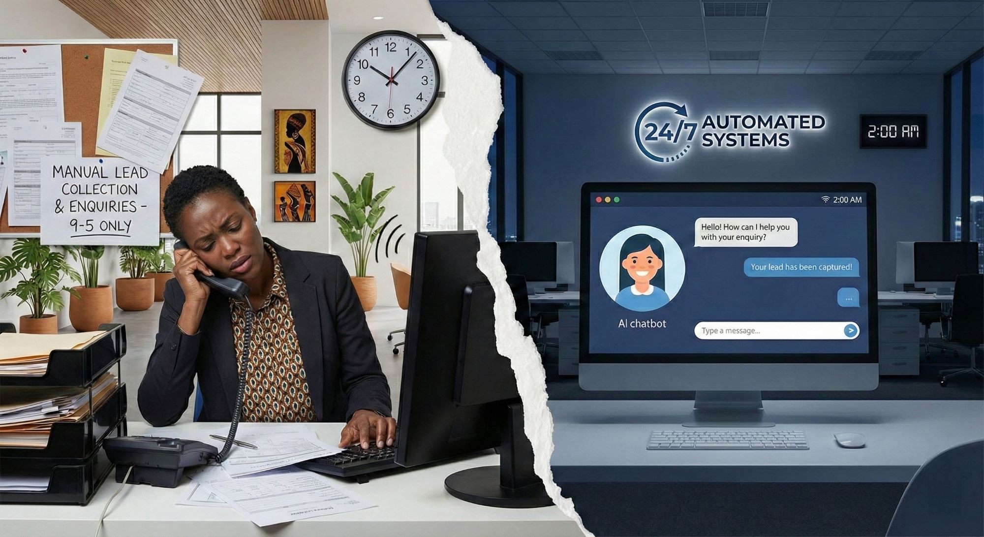 A split image showing two businesses on the left, a business using manual methods like contact forms to collect leads and answer enquiries; on the right, a business using automated systems like chatbots to handle enquiries and generate leads even at 2am